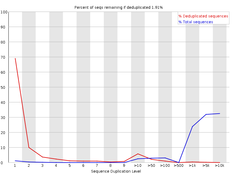 Represents how many sequences are unique in the library. For the amplicon libraries that may naturally have lower diversity, we may expect a high level of duplication and a red mark in this module. Also, some experimental aspects might influence here: low cell/RNA/DNA content in initial sample, degraded or damaged RNA/DNA, PCR over-amplification, etc.